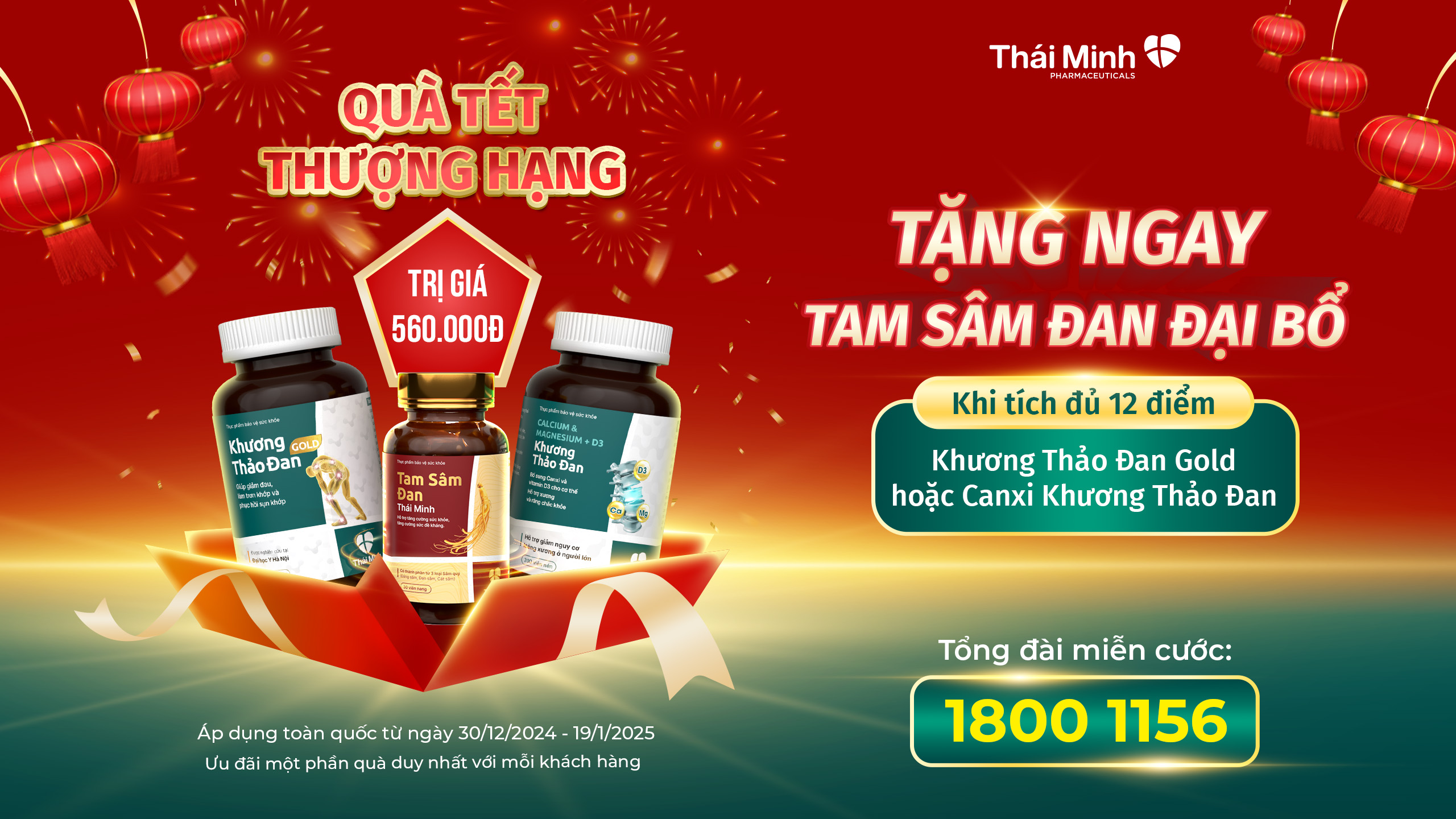 Xuân về, Tết đến, Dược phẩm Thái Minh và Khương Thảo Đan xin gửi tặng quý khách hàng món quà sức khỏe đầy ý nghĩa. Chương trình khuyến mãi đặc biệt dành riêng cho tháng 1 này sẽ mang đến nhiều bất ngờ thú vị! Khi mua và tích đủ 12 điểm Khương Thảo Đan Gold hoặc Canxi Khương Thảo Đan nhận ngay quà Tam Sâm Đan đại bổ trị giá 560.000đ.Chương Trình Khuyến Mãi Ngày TếtThông tin chi tiết chương trình:Mỗi khách hàng mua và tích mới 12 điểm Khương Thảo Đan Gold hoặc Canxi Khương Thảo Đan sẽ được nhận ngay: 1 Hộp Tam Sâm Đan Thái Minh trị giá 560.000đ2 Hộp Khương Thảo Đan Gold 30 viên hoặc 1 hộp Canxi Khương Thảo Đan 60 viên- Phần quà được công ty gửi đến tận tay khách hàng hoàn toàn miễn phí.- Thời gian áp dụng: Từ ngày 30.12.2024 đến hết ngày 19.01.2025.- Ưu đãi đặc biệt này chỉ diễn ra trong thời gian ngắn. Số lượng quà tặng có hạn. Hãy nhanh tay đặt hàng để nhận quà tặng hấp dẫn này nhé! Gọi ngay đến tổng đài miễn cước 1800 1156 để được tư vấn và đặt hàng!Thể lệ tích điểm khi mua hàng: Khương Thảo Đan Gold: lọ 30 viên tương ứng với 1 điểm, lọ 120 viên tương ứng với 4 điểm. Canxi Khương Thảo Đan: lọ 60 viên tương ứng với 2 điểm, lọ 200 viên tương ứng với 7 điểm.Nhân đôi giá trị quà tặng khi tích bằng số điểm ngay hôm nay:Tích 12 điểm Khương Thảo Đan Gold nhận ngay gấp đôi quà tặng gồm 2 hộp Khương Thảo Đan Gold 30 viên + 1 hộp Tam Sâm Đan: Tương ứng khi tích đủ 12 hộp Khương Thảo Đan Gold 30 viên hoặc 3 hộp Khương Thảo Đan Gold 60 viên.Tích 12 điểm Canxi Khương Thảo Đan nhận ngay gấp đôi quà tặng gồm 1 hộp Canxi Khương Thảo Đan 60 viên + 1 hộp Tam Sâm Đan: Tương ứng khi tích đủ 6 hộp Canxi Khương Thảo Đan Gold 60 viên hoặc 2 hộp Canxi Khương Thảo Đan 200 viên.Chương trình áp dụng mốc 12 điểm cho từng loại sản phẩm và không áp dụng chung cho trường hợp tích 2 sản phẩm cùng lúc.Cách nhận ngay quà tặng Tam Sâm Đan trị giá 560.000đKhi mua và tích đủ 12 điểm, chuyên viên Khương Thảo Đan sẽ liên hệ gửi tặng quý khách 1 hộp Tam Sâm Đan đại bổ trị giá 560.000đ. Quà tặng rất hấp dẫn, được gửi về tận nhà quý khách tiện lợi và không cần trả thêm chi phí nào khác. Đăng kí ngay tại đây:Hoặc quý khách có thể dễ dàng tìm mua Khương Thảo Đan Gold hoặc Canxi Khương Thảo Đan tại các nhà thuốc trên toàn quốc. Sau đó, cào nhẹ lớp tráng bạc để nhìn thấy mã cào và tích điểm trên hệ thống của Thái Minh theo các bước hướng dẫn trên tem. 2 cách tích điểm nhận quà cùng Khương Thảo Đan Khi tích đủ 12 điểm sẽ có chuyên viên Khương Thảo Đan liên hệ gửi tặng quý khách phần quà trị giá 560.000đ. Lưu ý: Mỗi khách hàng nhận được duy nhất 1 phần quà ưu đãi.Quà tặng được gửi về tận nhà quý khách và không mất thêm chi phí nào khác.Tam Sâm Đan Thái Minh - Món Quà Ý Nghĩa Cho Sức KhỏeVới sự kết hợp hoàn hảo của ba loại sâm quý: Đảng sâm, Đan sâm và Cát sâm, cùng các thảo dược quý hiếm khác. Tam Sâm Đan Thái Minh mang đến cho bạn một giải pháp để tăng cường sức khỏe, nâng cao sức đề kháng. “Bộ ba vàng cho hệ xương khớp khỏe mạnh!* Kết hợp hoàn hảo Khương Thảo Đan Gold giúp giảm đau nhức, phục hồi sụn khớp, Canxi Khương Thảo Đan bổ sung canxi giúp xương chắc khỏe và Tam Sâm Đan Thái Minh tăng cường sức đề kháng, giúp bạn hoạt động năng động mỗi ngày. Hãy mua và tích đủ 12 điểm Khương Thảo Đan Gold hoặc Canxi Khương Thảo Đan để nhận ngay quà tặng!Nhanh tay mua hàng và tích lũy điểm để nhận quà ngay hôm nay!