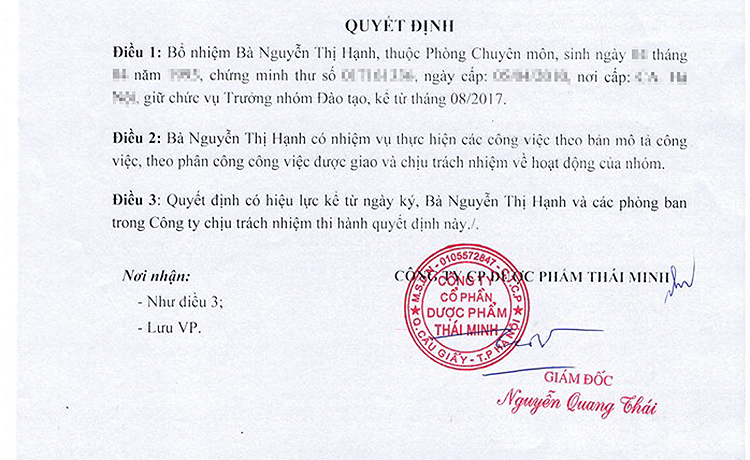 Cô gái 9x Nguyễn Thị Hạnh đang là cái tên gây sự chú ý của toàn thể công ty bởi thành tích đáng nể thăng chức sau gần một năm làm việcTrong cuộc họp giao ban tháng 7/2017 BGĐ Công ty cổ phần Dược phẩm Thái Minh đã thông báo quyết định bổ nhiệm bạn Nguyễn Thị Hạnh – nhân viên phòng Chuyên môn thăng chức lên Trưởng nhóm đào tạo phòng Chuyên môn từ 1/8/2017.Nguyễn Thị Hạnh là cô gái trẻ trung, xinh đẹp, sinh năm 1993 “gia nhập” vào Công ty cổ phần Dược phẩm Thái Minh từ tháng 8 năm 2016 tại vị trí nhân viên phòng chuyên môn. Sau gần một năm làm việc nỗ lực và cố gắng của cô gái ấy đã được đền đáp.Quyết định của BGĐ Công ty cổ phần Dược phẩm Thái Minh.Cầm tờ quyết định trên tay Hạnh không khỏi xúc động: “Rất may mắn khi em được bổ nhiệm chức vụ mới này. Em cảm thấy rất vui và cảm ơn đại gia đình Thái Minh. Đặc biệt gửi lời cảm ơn sâu sắc tới chị Nguyễn Thị Thanh Thúy – trưởng phòng Chuyên môn, đã giúp đỡ tạo điều kiện, hướng dẫn, chỉ bảo em cả trong công việc lẫn úng xử đời sống. Em mong trong thời gian tới đại gia đình Thái Minh cùng nhau đoàn kết đạt được mục tiêu và sứ mệnh. Chúc gia đình Thái Minh luôn mạnh khỏe và đạt được kết quả cao nhất trong công việc”.Giây phút hạnh phúc của Hạnh khi được gia đình Thái Minh chúc mừng thăng chức.Được biết công việc của Hạnh tại phòng chuyên môn là tư vấn về bệnh lí, cũng như trực tiếp đưa ra những lời khuyên để cải thiện tình hình sức khỏe cho mọi khách hàng gọi đến tổng đài Chăm sóc Sức khỏe của Thái Minh. Tất cả các khách hàng gọi đến sẽ được Hạnh cũng như các nhân viên tư vấn ghi lại triệu chứng bệnh, rồi từ đó theo dõi bệnh tình để có thể tư vấn, đưa ra lời khuyên để cải thiện tình trạng bệnh mà họ đang gặp phải.Đặc biệt, Hạnh còn là người đào tạo và truyền cảm hứng trong công việc cho rất nhiều nhân viên mới vào đại gia đình Thái Minh. Cô gái xinh xắn, nhỏ nhắn ấy đã và đang là tấm gương để nhiều thành viên trong tập thể Thái Minh noi theo. Chúc Hạnh luôn giữ vững phong độ, có nhiều sức khỏe và đạt kết quả cao hơn nữa trong công việc.
