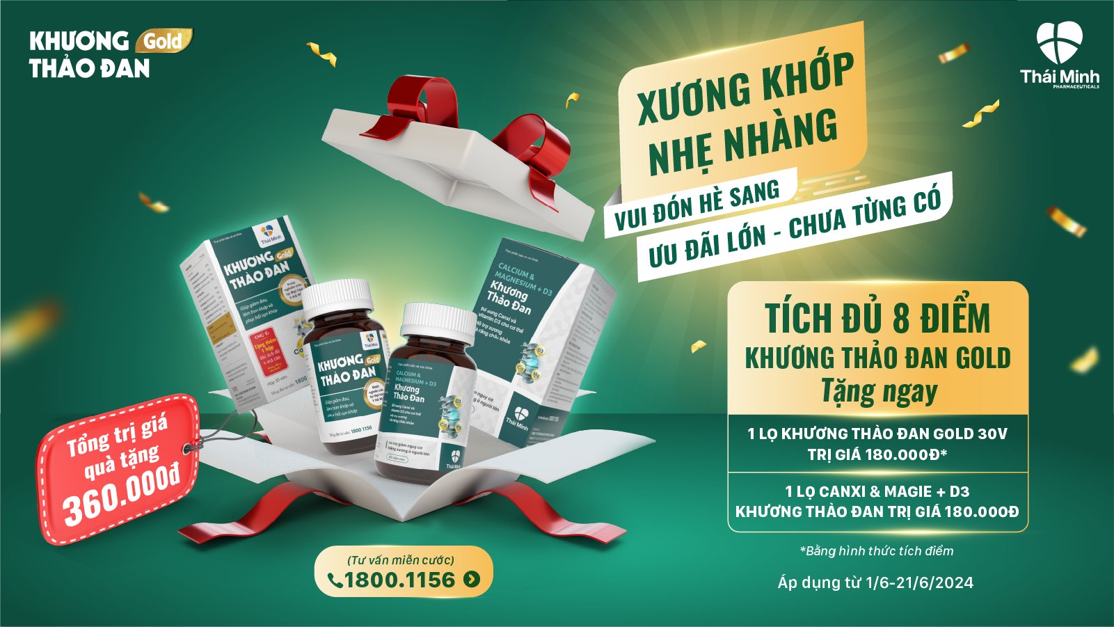 Thay lời cảm ơn và tri ân sâu sắc nhất tới tất cả các khách hàng đã tin tưởng sử dụng sản phẩm trong suốt thời gian qua, Khương Thảo Đan Gold dành tặng ưu đãi đặc biệt: Mua và tích đủ 8 điểm Khương Thảo Đan Gold nhận ngay quà tặng trị giá 360.000đ.Thông tin chi tiết chương trình:Mỗi khách hàng mua và tích mới 8 điểm Khương Thảo Đan Gold sẽ được nhận ngay:1 Hộp Canxi Khương Thảo Đan 60 viên trị giá 180.000đ1 Hộp Khương Thảo Đan Gold 30 viên trị giá 180.000đ (theo chương trình tích điểm 6+1 thông thường).Tổng giá trị quà tặng lên đến 360.000đ - Phần quà được công ty gửi đến tận tay khách hàng hoàn toàn miễn phí.- Thời gian áp dụng: Từ ngày 01.06.2024 đến hết ngày 21.06.2024.Đây là ưu đãi chưa từng có của Khương Thảo Đan Gold. Nhanh tay mua và tích điểm theo đúng thời gian chương trình để nhận ưu đãi đặc biệt này ngay hôm nay!BẤM VÀO ĐÂY để tìm nhà thuốc bán Khương Thảo Đan Gold gần nhấtQuý khách có thể dễ dàng tìm mua Khương Thảo Đan Gold tại các nhà thuốc trên toàn quốc. Sau đó, cào nhẹ lớp tráng bạc để nhìn thấy mã cào và tích điểm trên hệ thống của Thái Minh theo các bước hướng dẫn trên tem.2 cách tích điểm nhận quà cùng Khương Thảo Đan GoldKhi tích đủ 8 điểm sẽ có chuyên viên Khương Thảo Đan liên hệ gửi tặng quý khách 1 hộp Canxi Khương Thảo Đan 60 viên và 1 hộp Khương Thảo Đan Gold 30 viên, tổng phần quà trị giá 360.000đ.Lưu ý: Mỗi khách hàng nhận được duy nhất 1 phần quà ưu đãi.Quà tặng được gửi về tận nhà quý khách và không mất thêm chi phí nào khác.Một lọ Khương Thảo Đan Gold 30 viên tương ứng với 1 điểm, 1 lọ 120 viên tương ứng với 4 điểm.Hiện tại Khương Thảo Đan Gold có bán tại 10.000+ nhà thuốc trên toàn quốc. Mua sản phẩm chính hãng tại nhà thuốc gần nhất để nhận được ưu đãi đặc biệt cho xương khớp khoẻ mạnh, giúp cải toàn diện chất lượng cuộc sống!Sản phẩm không phải thuốc, không có tác dụng thay thế thuốc chữa bệnh