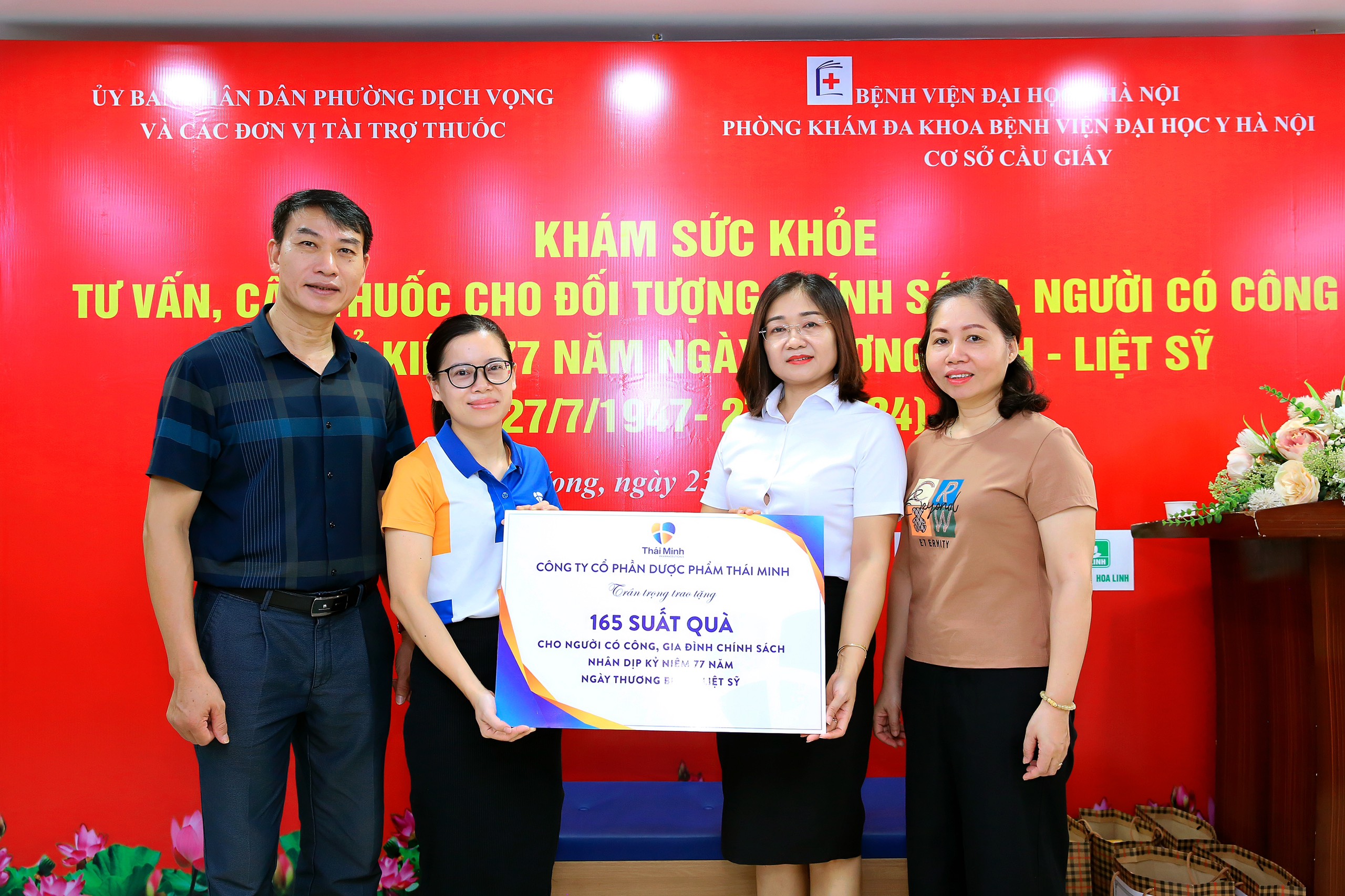 Sáng ngày 23/6, tại phòng khám Bệnh viện Đại học Y – cơ sở Cầu Giấy, Dược phẩm Thái Minh đã trao 165 suất quà cho đại diện UBND phường Dịch Vọng nhân dịp 77 năm ngày Thương binh liệt sĩ.Đây là hoạt động xã hội thiết thực của Dược phẩm Thái Minh tại phường Dịch Vọng hàng năm thể hiện truyền thống tốt đẹp “Uống nước nhớ nguồn” của dân tộc Việt Nam. Những năm qua, Dược phẩm Thái Minh trở thành một trong những gương mặt tiêu biểu trong hoạt động xã hội tại phường Dịch Vọng, quận Cầu Giấy.Bà Trần Hải Yến - Phó Chủ tịch UBND phường Dịch Vọng ghi nhận sự đóng góp của Dược phẩm Thái Minh cho các hoạt động vì cộng đồng của phường nói riêng và xã hội nói chung. Bà cũng bày tỏ mong muốn sẽ được Thái Minh đồng hành trong các hoạt động trong thời gian tới.Bà Trần Hải Yến - Phó Chủ tịch UBND phường Dịch Vọng đón nhận 165 suất quà từ Dược phẩm Thái MinhNgười có công, gia đình chính sách nhận quà từ Dược phẩm Thái Minh nhân dịp kỉ niệm 77 năm ngày Thương binh – Liệt sỹ